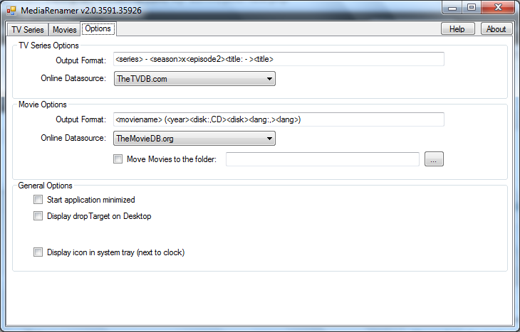After opening it go to the options tab, shown below, and modify the Output Format to match how you would like the files to be named. It doesn’t matter how the files are currently named as Media Renamer will scan The TVDB or the Movie DB to get the relevant information. Once the options are set click the tab for renaming TV or movie files. Click the button labeled “…” to browse to the folder containing your media files then click the “Start Scan” button. It will display the files in the list below with all the appropriate meta-data. Then simply click the files that you would like to rename and click the “rename selected episodes” button.